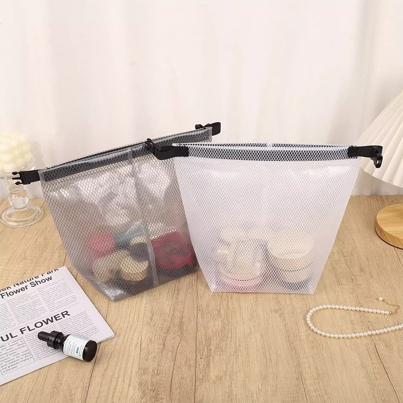 Dual-size travel cosmetic bag and toiletries storage bag: Includes 2 transparent PVC storage bags (large: 13.8" x 10.8" x 6.1", small: 10.6" x 9.7" x 4.5"). Decorative mesh panels allow you to instantly find travel-sized toiletries, makeup brushes or fitness essentials. A great storage bag for travelers!